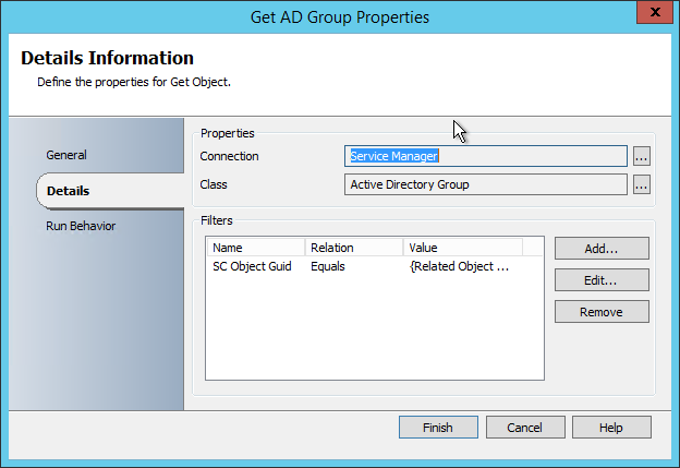 Now we’ll get the group in Active Directory. Note: the way Service Manager presents the group is domainnamegroupname which is why I have selected Username Group the Get AD Group activity in Service Manager.