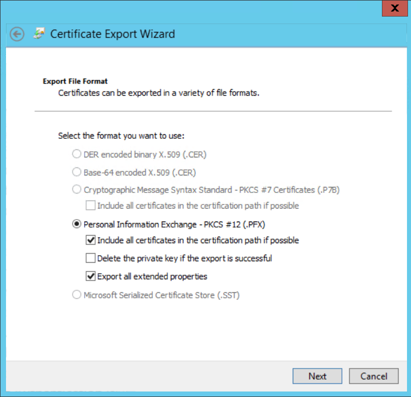 Select Yes, export the private key (this is absolutely necessary, without the private key there is no trust when using the certificates.)