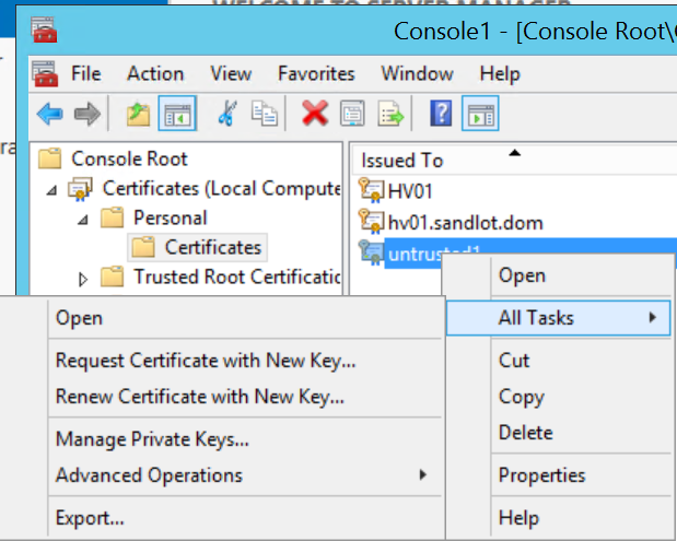 On your untrusted server copy the certificate you just created to the local server. Open MMC and load the Certificates snapin for local computer. On Personal right click and select All Tasks -> Import.